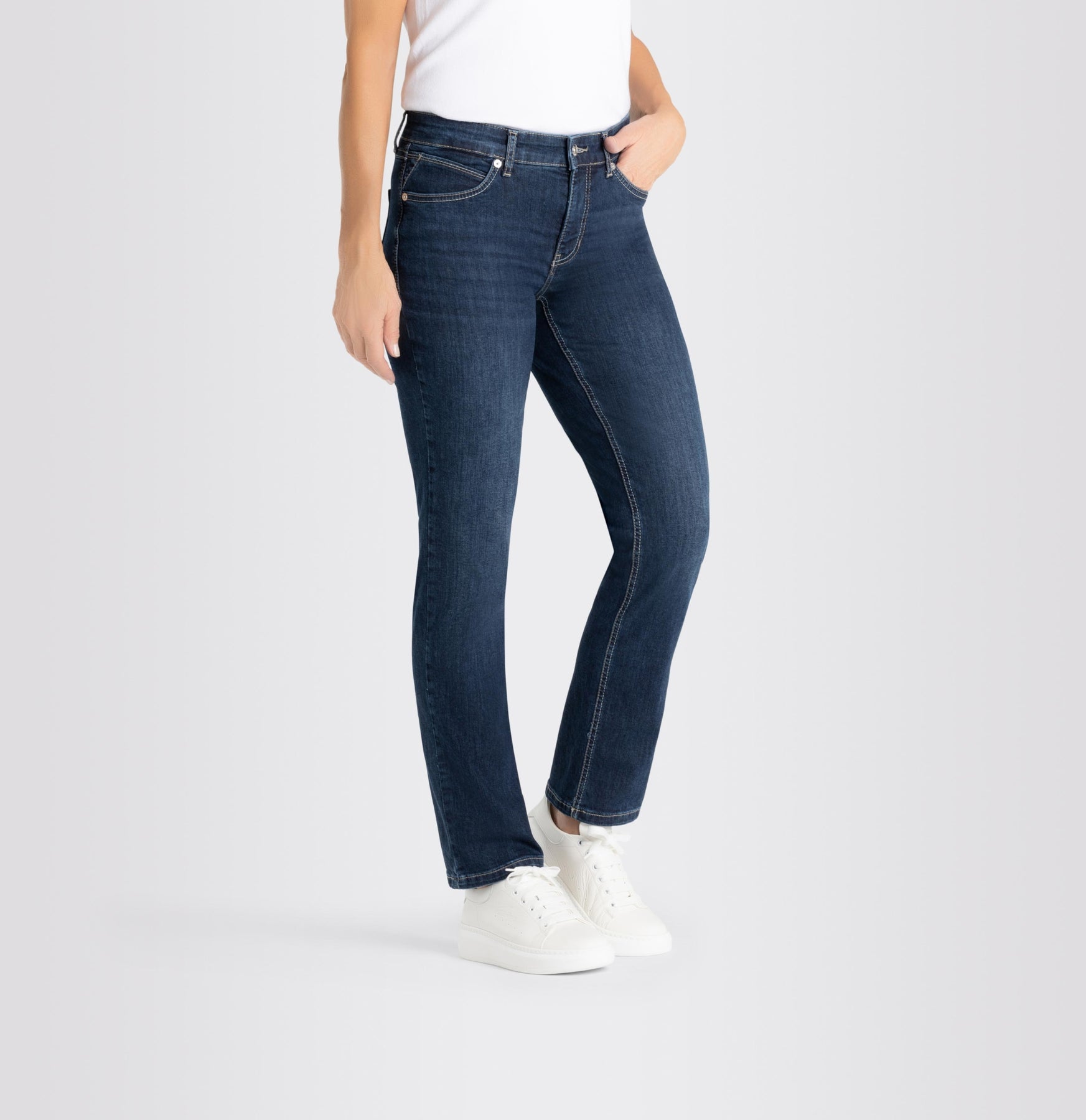 Feminine Fit, Straight Leg, gerade Silhouette, angezogene, leicht erhöhte Leibhöhe, schmale Taille, bequem an Gesäß und Oberschenkel, Five Pocket, sportive Naht-Details am Tascheneingriff, hochwertiger Comfort Stretch Denim, über Better Cotton gesourcte Baumwolle, hervorragende Passform, authentische Optik, Das Model ist 1,75m groß und trägt die MAC Hosengröße 36, Fußweite bei Größe 36: 35cm Material: 98%CO/2%EL