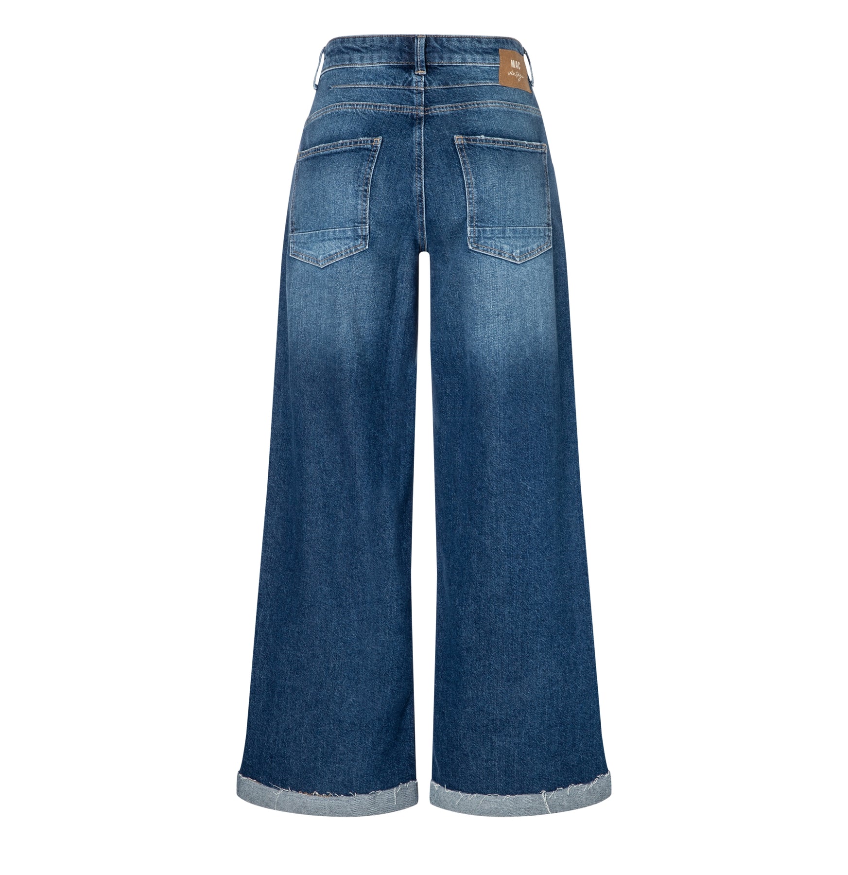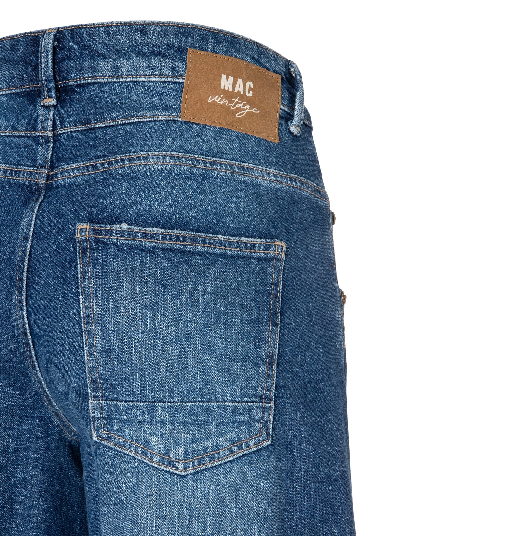 Wide Fit, Wide Leg, gerades, weites Bein, bequem an Gesäß und Oberschenkel, mittlere Leibhöhe, schmale Taille, Five Pocket, schmal umgeschlagener Saum mit offener Kante, lässige Destroyed-Effekte, sportive Naht-Details, hochwertige Rigid Denim-Qualität in 11oz., authentischer Jeans Look, angenehmer Griff, hoher Tragekomfort, Das Model ist 1,75m groß und trägt die MAC Hosengröße 36, Fußweite bei Größe 36: 66cm Material: 99%CO/1%EL